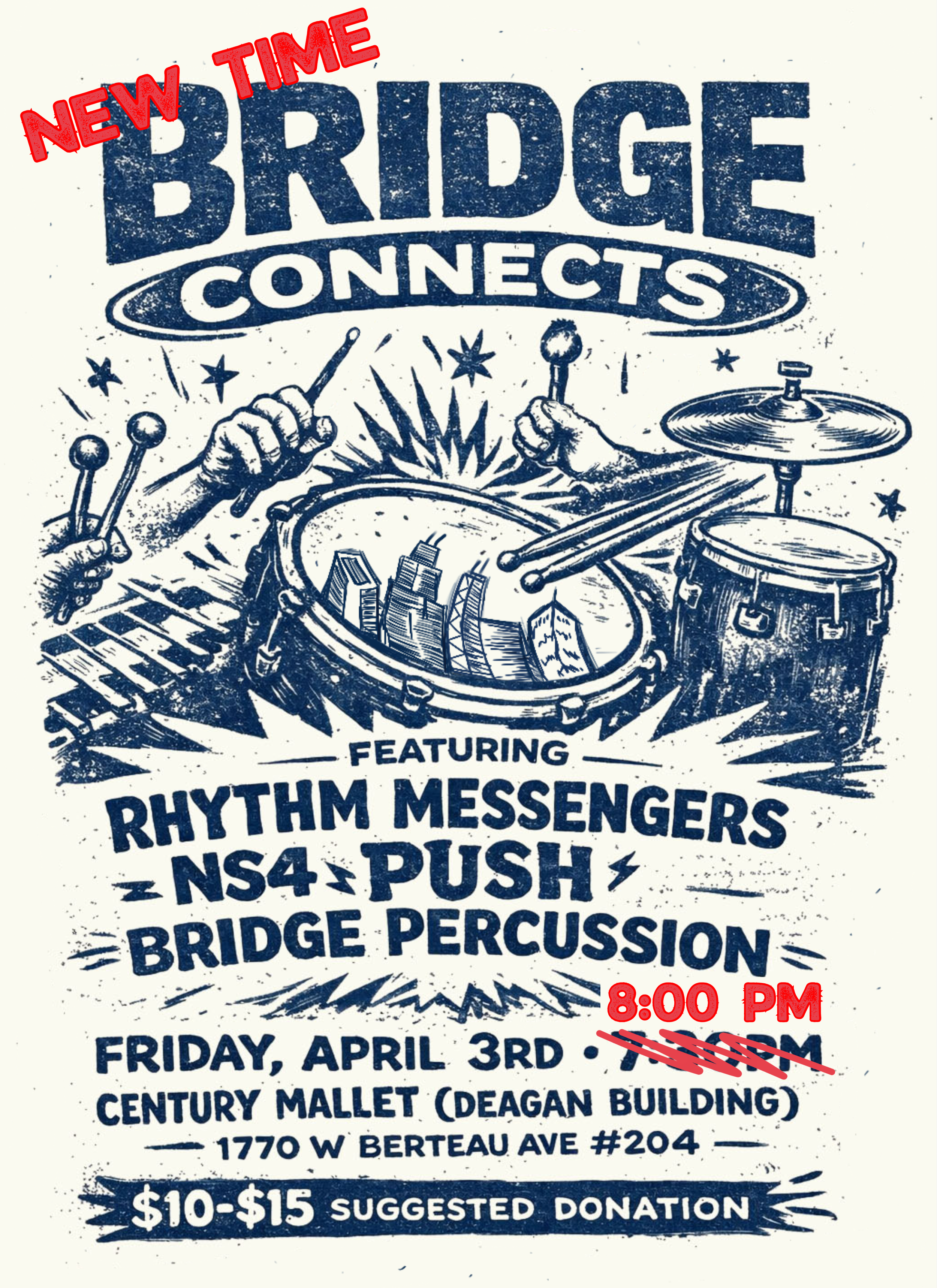 Join us for the debut concert of Bridge Connects, a new concert series presented by Bridge Percussion emphasizing community and collaboration. Featuring Bridge Percussion, PUSH, NS4, and The Rhythm Messengers!